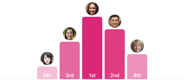 , sets up how our podium is layed out. Rather than having a left-to-right placement of the 1st, 2nd, 3rd, 4th, etc. place positions, we want to stagger them left and right, with the first place in the center, and lower ranks towards the outside. You know. Like a typical winner podium. We could have created a fancy algorithm to compute this for us, but the beauty here is in the simplicity of listing out the positions in an array. It's visually clear to us in code how the podium will be structured. And, if we wanted a different layout, we could move the numbers around as desired. Try it!